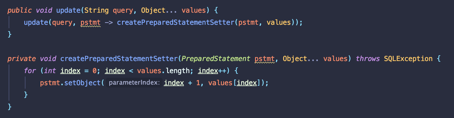 - Parameter에 쿼리문이랑 statement에 set해줄 데이터를 넣는 update 메소드를 만든다.