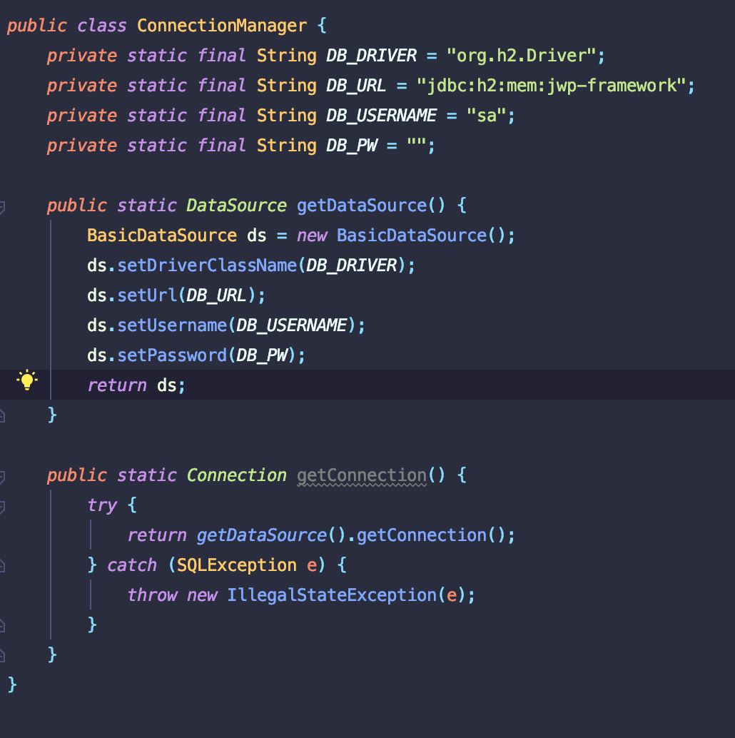 - Connection 의 정보를 가지고 있고 Bean 으로 등록하여 인자를 넘겨준다.