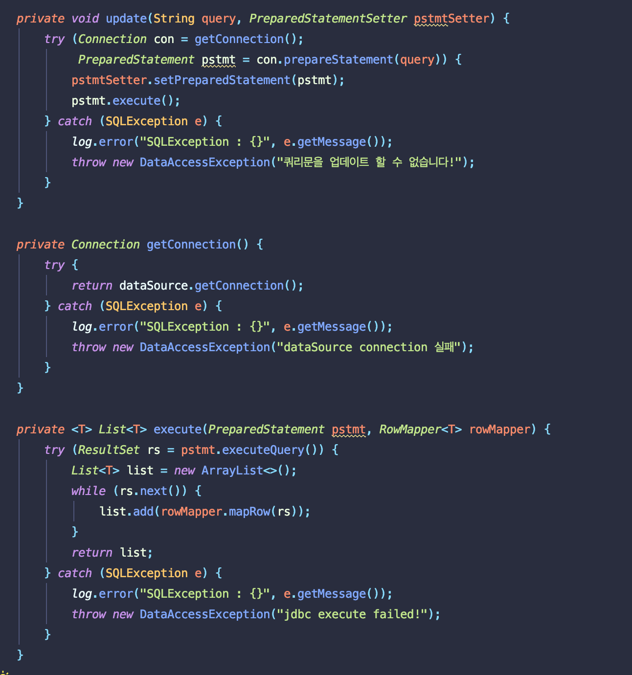 - 가변인자로 받아온 value값들을 넣어줄 createPreparedStatementSetter 메소드를 만들어 statement를 set해준다. 이때 실질 적으로 set을 한게 아니라 추상화를 통해 만들어 놓고 밑에서 실질적으로 set하겠금 해준다.