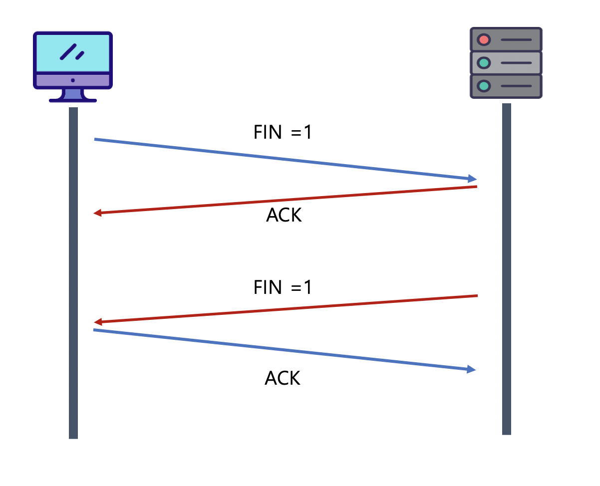 - 서로 타임 웨이트를 가지고(못받은 데이터가 있을 수 있기 때문에) 이상 없을 경우 서버에서 FIN을 1로 설정해 클라이언트에게 보낸다.