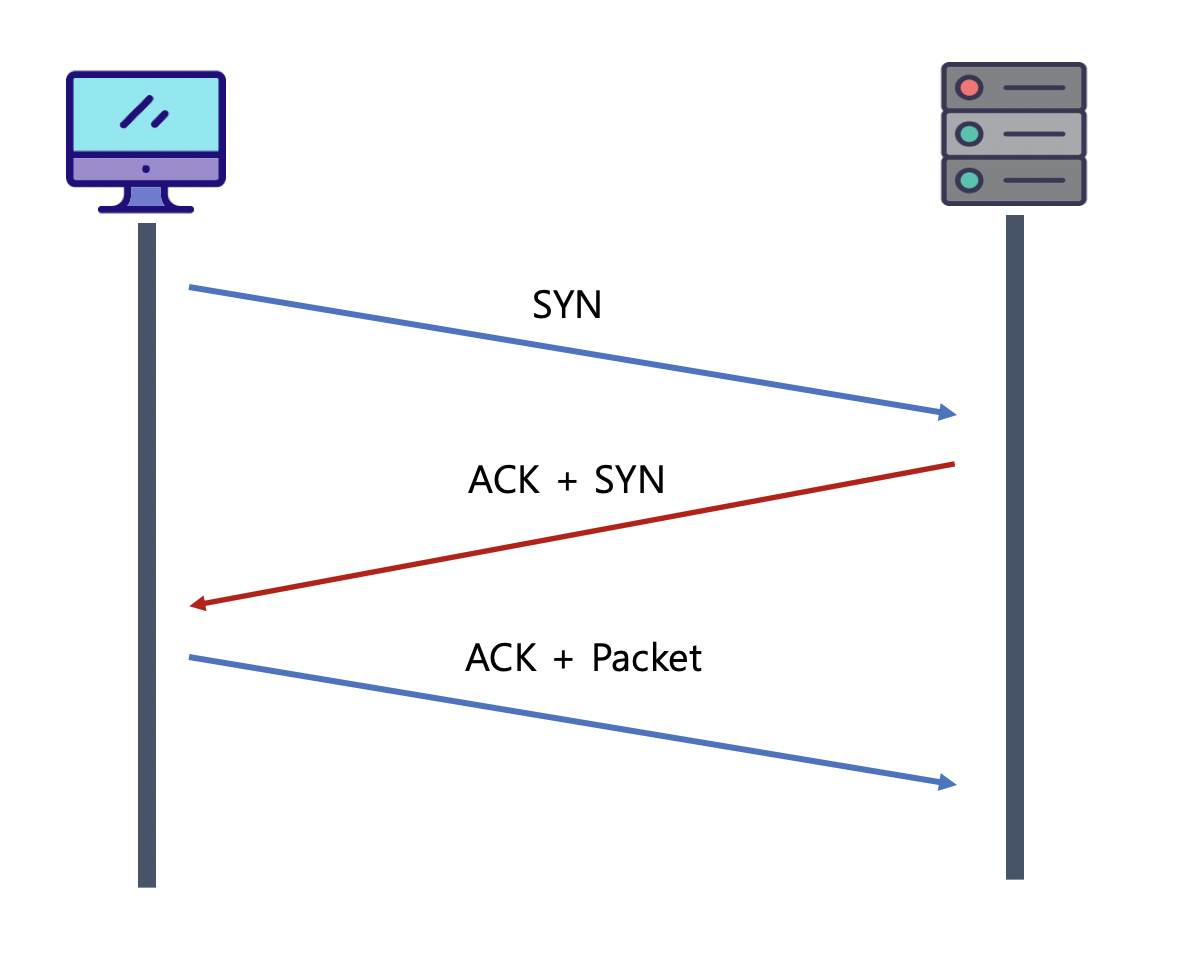 - 서버에서 ACK + SYN을 받았으면 클라이언트는 ACK + Packet을 보낸다.
