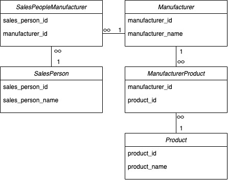 해당 다이어그램은 SalesPeopleManufacturer, ManufacturerProduct 라는 다대다 관계의 테이블이 존재합니다. 이렇게 구조를 하면 좋은 점은 다음과 같습니다.
