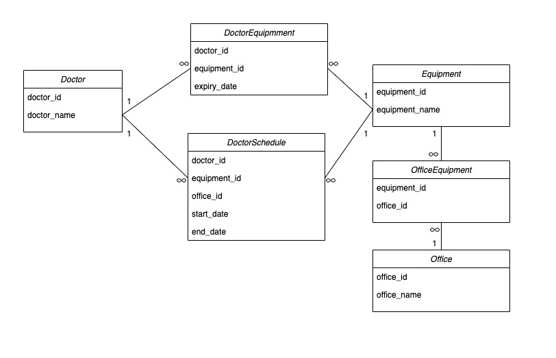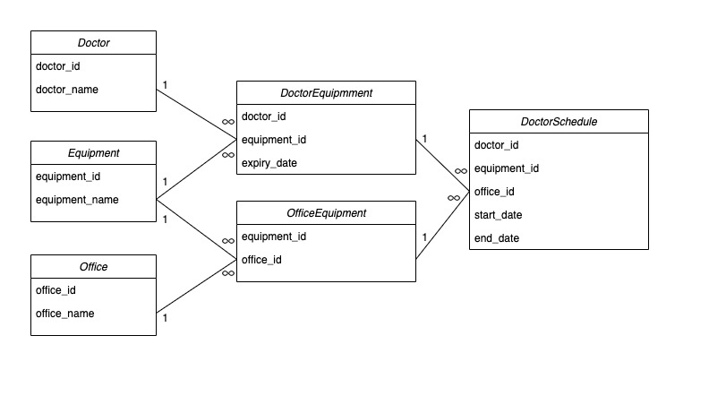 하지만 우리는 또 하나의 사실을 간과하고 있습니다. 바로 비즈니스 규칙입니다. 의사는 해당 장비를 다루는 교육을 이미 받았다. 그렇기에 장비 사용 자격이 없는 검사실로 의사를 보내지 않는다. 이 규칙을 통해 DoctorSchedule 테이블에 equipment_id 컬럼이 필요하지 않을 것입니다. 단지 의사를 검사실에 예약만 하면 됩니다.