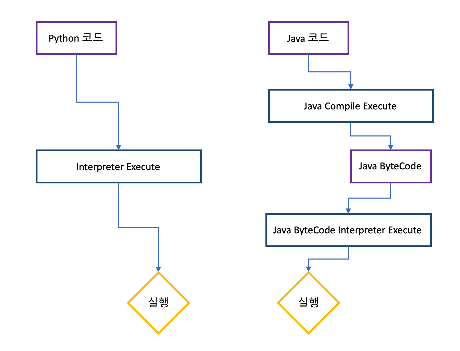 이 그림은 파이썬과 자바의 동작 과정을 그림으로 표현한 도식화입니다. 이 둘의 차이점은 무엇일까요? 바로 파이썬은 인터프리트 방식을 한 번만 거치고 자바는 컴파일과 인터프리터 방식 둘 다 거칩니다. 여기서 컴파일 방식은 소스코드를 한꺼번에 기계어로 변환하는 방식이고 인터프리터 방식은 런타임시에 한 줄씩 읽어 기계어로 변환하는 것을 말합니다.